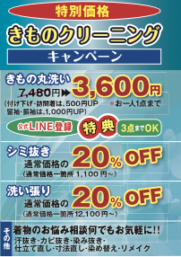 - きもの丸洗い7,480円⇒3,600円(お一人様1点まで)*公式line登録の方は、3点までOK (付け下げ・訪問着は、500円UP 留袖・振袖は、1,000円UP)