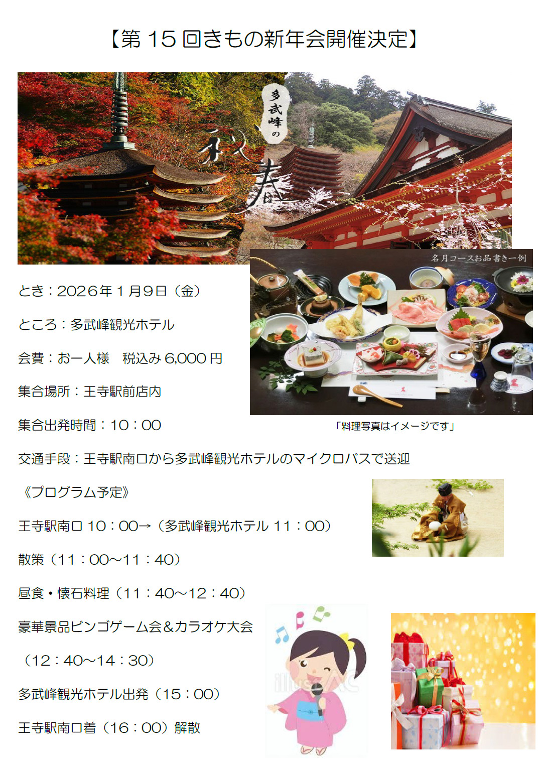 今回は、「第15回きもの新年会」開催についてのお知らせです。