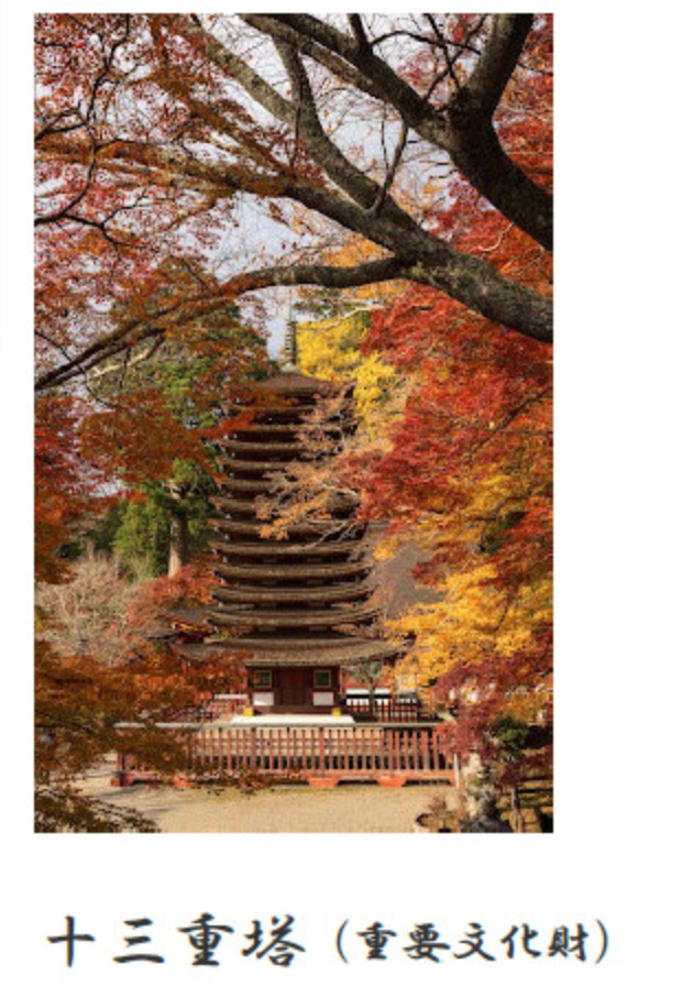 現存する木造の十三重塔は世界で唯一であり、重要文化財に指定されています。