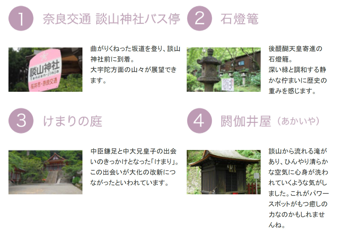 その他にも、大宇陀方面の山々が展望できる「談山神社バス停」や後醍醐天皇寄進の「石燈篭」、「けまりの庭」、「閼伽井屋(あかいや)」など歩くたびに出会える魅力がたくさんあります。