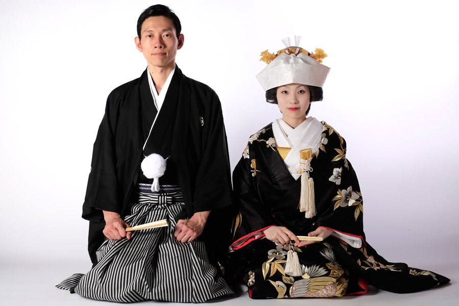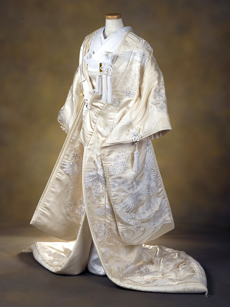 綿帽子や角隠しを合わせるのが特徴で、白無垢は白一色で仕立てられています。