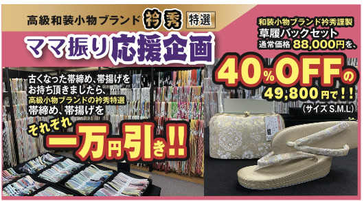 お持ちくださった方にはもれなく、高級小物ブランド衿秀の帯締め、帯揚げをそれぞれ1万円引きにさせていただきます。