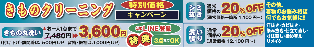 - きもの丸洗い7,480円⇒3,600円(お一人様1点まで)*公式line登録の方は、3点までOK (付け下げ・訪問着は、500円UP 留袖・振袖は、1,000円UP)