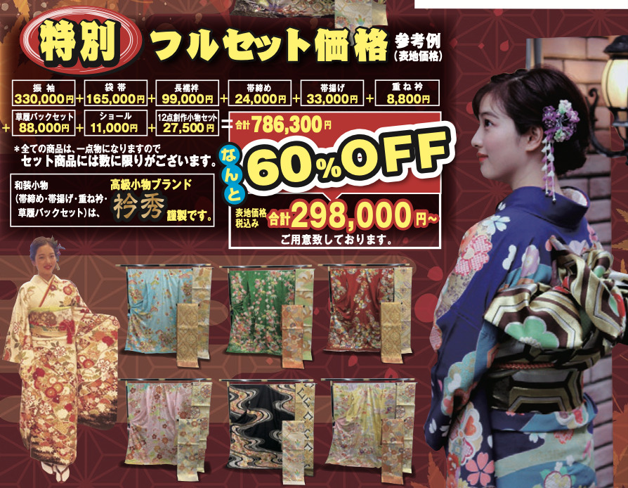 振袖、袋帯、長裾衿、帯締めなどなどお得なフルセットを通常の60%OFFで提供することが決定しています!