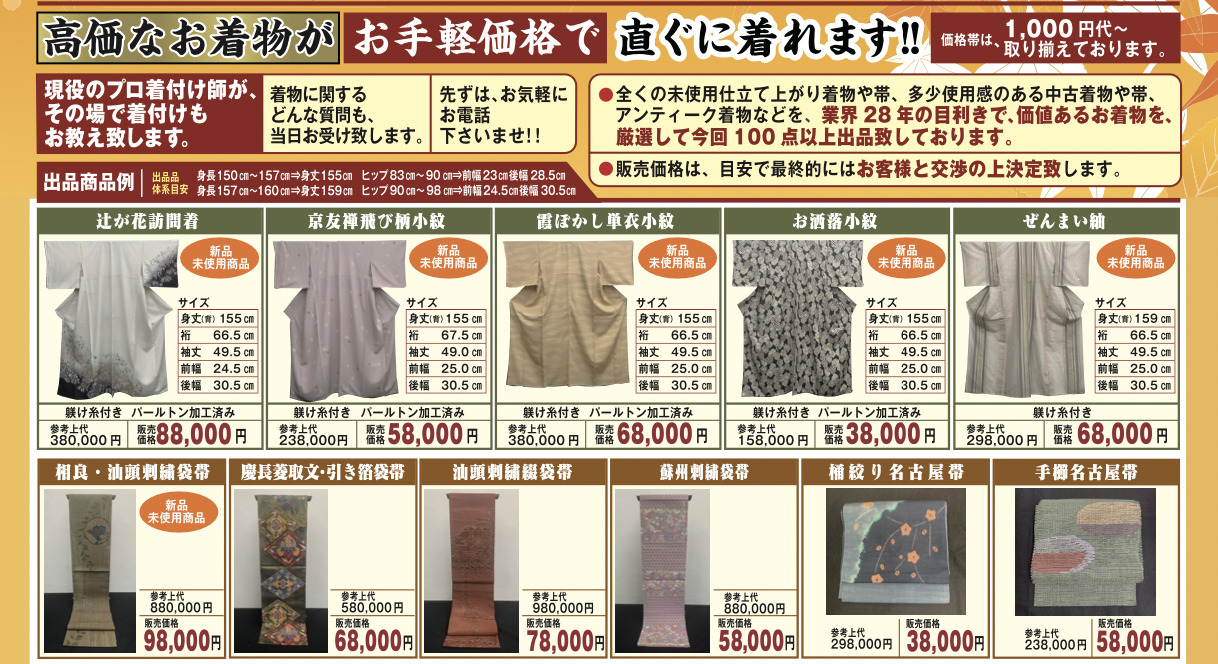 その他にも多少使用感のある中古着物や帯、アンティーク着物など業界28年の目利きで価値のある置物を厳選して100点以上出品しています。