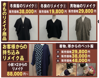 着物だけでなく着物のリメイク品も販売しています。
