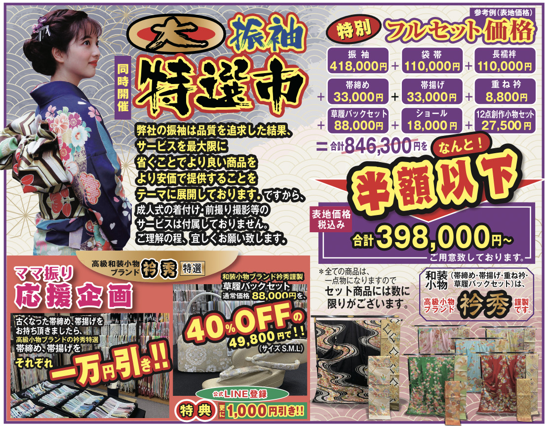 振袖、袋帯、帯揚げ、重ね衿、草履や小物など全てセットです!