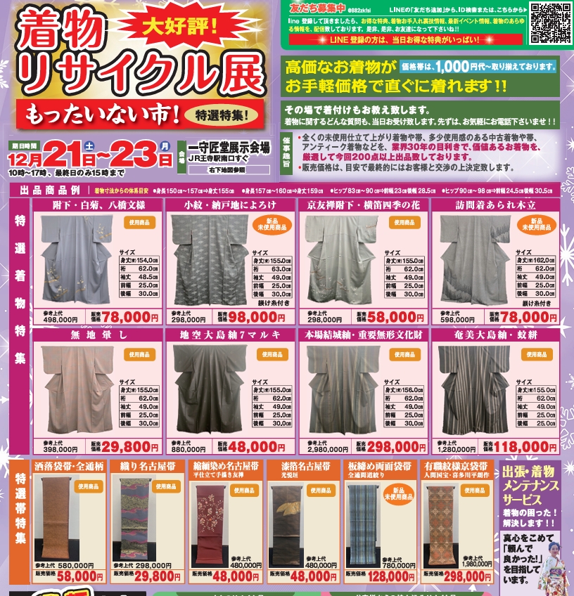 開催が近づいてきた12月の「着物リサイクル展~もったいない市!~」の特徴は以下の通りです。