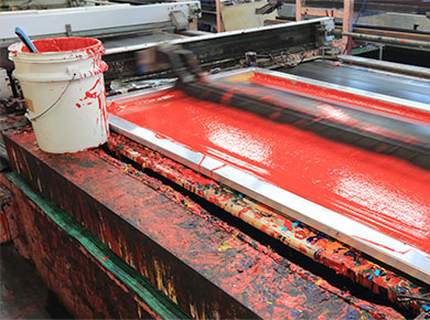 図案通りに染まるよう型を合わせてロールにセットし、生地をプリントしていきます。